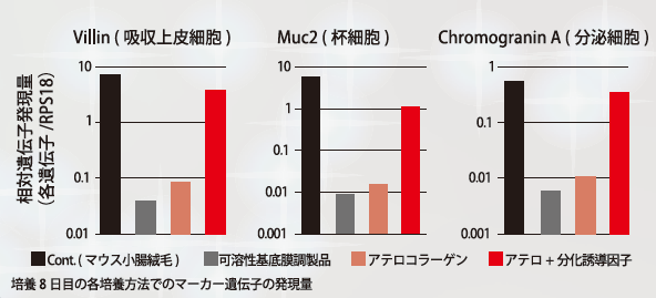 両基材での分化マーカー遺伝子の発現に大きな差は無く、アテロコラーゲンに分化誘導因子を組み合わせることで、分化マーカー遺伝子の発現が大きく増加した。(製品よりもやや濃度の高い0.5%のアテロコラーゲンゲルを使用した社内データ)